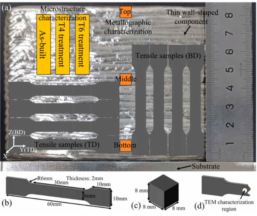 样品的示意图。( a )薄壁件的宏观形貌及试样的提取位置。( b )拉伸试样尺寸。( c )微结构表征样品的尺寸。( d )断裂拉伸试样的TEM表征位置。采用电感耦合等离子体原子发射光谱仪(Inductively Coupled Plasma- Atomic Emission,ICP-AES )测量了焊丝和熔敷金属的成分光谱学(矿质无机营养, NexION 350D)。如图1a所示,采用直径为1.2 mm、实际化学成分为Mg - 4.26 Gd - 2.06 Y - 1.18 Zn - 0.36 Zr ( wt % )的定制GWZ421K镁合金作为填充焊丝,通过丝-弧DED系统制备薄壁构件。基材为轧制态AZ31镁合金板材,尺寸为160 mm × 160 mm × 30 mm。综合考虑薄壁构件的表面粗糙度、成形效率和工艺稳定性,采用双向沉积策略,送丝速度设置为4.5 m / min,行进速度设置为0.4 m / min,电流为78 A,电压为12.4 V。如图1a所示,单道多层薄壁构件的长度、高度、宽度和层数分别约为126 mm、84 mm、10 mm和28层。由于Mg和Zn元素的蒸发通量高于其他合金元素,沉积成分的实际化学成分变化为4.41 % Gd,2.19 % Y,0.95 % Zn和0.45 % Zr 。