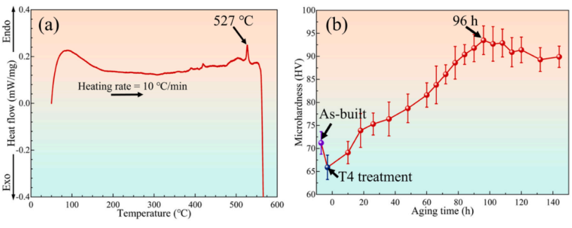 确定热处理工艺参数的标准。( a )成型试样的DSC曲线。( b ) T6态试样的时效硬化曲线。由于Mg - Gd - Y - Zn - Zr合金具有显著的固溶强化和时效硬化特性,因此对制备态试样的固溶和时效处理参数进行了研究。以10℃/ min的升温速率进行差示扫描量热( DSC )分析,确定固溶处理的温度。GWZ421K试样的DSC曲线如图2a所示,峰值温度为527℃,表明共晶相在接近527 ℃的温度下发生溶解,因此选择530℃进行1 ~ 14 h的固溶处理。根据残余析出相数量和晶粒长大程度,确定了优化的固溶时间。综合后续实验结果,确立最优的溶液参数为温度530℃,时间12 h。根据先前的研究结果,Mg - Gd - Y - Zn - Zr合金的理想时效温度为200℃。因此,本研究中的样品在上述最佳溶液参数处理后,在200℃下老化10 ~ 144 h。如图2b所示,根据峰值显微硬度发现最佳时效处理时间为96 h。为便于使用,将未经热处理的试样定义为铸态试样,经固溶处理和固溶+时效处理的试样分别定义为T4和T6态试样。