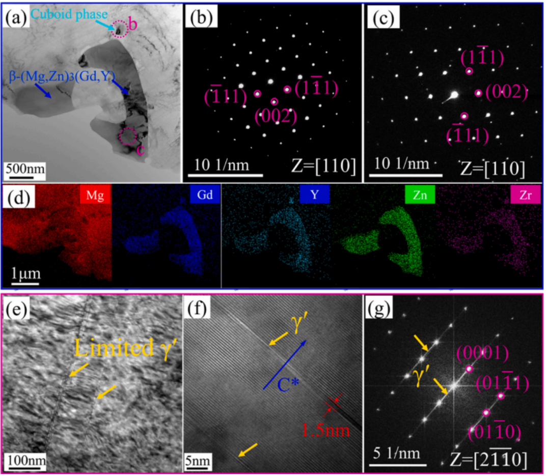 样品的TEM结果。( a )析出相的明场( BF )图像。( b )长方体相的SAED花样。( c ) β-( Mg、Zn)3 ( Gd,O )的SAED花样。Y )。( d )典型析出相的EDS面扫描。( e )基面γ′相的BF图像,( f )基面γ′相的高分辨TEM ( HRTEM )图像和相应的( g )基面γ′相的SAED图像。TEM图像沿[ 20 ] α区轴拍摄。图4为制备态试样中析出相的TEM表征结果。如图4a - c所示,选区电子衍射( SAED )结果表明,微米尺度下的析出相为β - ( Mg、Zn)3( Gd , Y),而亚微米尺度下的析出相为长方体相。SAED图谱也表明这些β - ( Mg、Zn)3( Gd , Y)具有面心立方( fcc )结构。图4d的EDS面扫描结果表明,长方体相主要富集稀土元素根据前期研究[ 6 ],长方体相极有可能是面心立方结构的( Gd , Y)H2化合物。此外,如图4e - g所示,在原始样品中可以观察到少量宽度约为1.5 nm的基面γ′相。此外,图4 ( f , g)显示,基面γ′相与α- Mg之间的位向关系为( 0001 ) γ′/ / ( 0001 )α - Mg和[ 20 ] γ′/ / [ 20 ]α-Mg [ 34 ]。
