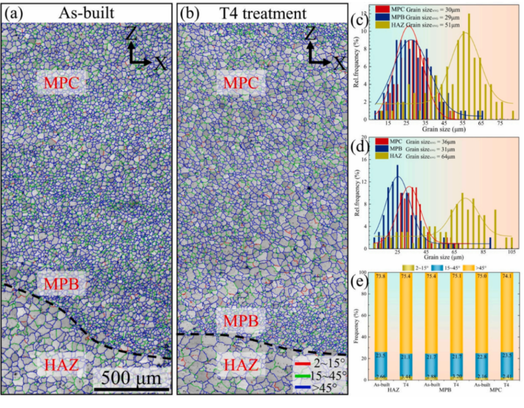 ( a )原始态和( b ) T4态样品不同取向差角度的晶界分布图。统计了( c )铸态和( d ) T4态试样的晶粒尺寸。( e )统计熔池不同区域的晶界特征。利用EBSD技术对铸态和T4态试样的晶体学取向、晶粒尺寸分布和晶界性能进行了检测,如图所示。5和6 .可以从中发现图5( a , b)和图6( a , b)表明,在构建和T4试样呈现梯度分布。具体而言,如所示图6c中,对于自生试样,粗大晶粒( ~ 51 µ m)分布在HAZ,细化晶粒分布在MPB ( ~ 29 µ m)和 MPC ( ~ 30 µ m)。如图6d所示当进行固溶处理时,晶粒会发生一定程度的长大,这可归因于T4处理过程中高温诱导的热激活和高达98 %的HAGBs提供的高界面能促进晶界迁移[ 35 ]。图5( a , b)和图6( a , b)表明MPB的高度约为400 µ m。由于图3表明MPB和MPC的总高度为2.1 mm,因此MPC的高度约为1.7 mm。此外,As - Build和T4样品表现出近随机的晶粒取向,最大的均匀分布倍数( MUD )值约为2 - 4 (图5c - d ),与区域无关。如图6e所示取向差在2 ~ 15 °之间的小角度晶界( LAGBs )在原始态和T4态试样中的含量都只有2 ~ 3 %左右。此外,取向差角大于45 °的大角度晶界( HAGBs )约占75 %。从统计结果图6e可以推断,固溶处理对丝材电弧的晶界性能几乎没有影响Ded -制备的Gwz421K合金。