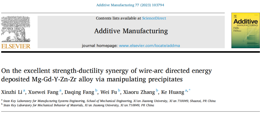 在此,西安交通大学机械工程学院制造系统工程国家重点实验室黄科教授团队研究了通过调控析出相,利用电弧定向能量沉积Mg - Gd - Y - Zn - Zr合金优异的强塑性协同作用。在这项研究中,通过使用定制的电弧DED成功地制造了具有单层多层特征的组件Mg - Gd - Y - Zn - Zr合金,借助先进的表征技术,系统研究了固溶处理和时效处理对析出相、晶粒特征、拉伸性能和变形行为的影响。此外,还揭示了热处理引起的微观组织演变、强度提高和优异的强塑性协同作用的详细机制。为了给具有复杂几何形状的大尺寸镁合金构件的合金设计和析出相调控提供新的思路,本研究探索了一种具有优异强塑性协同作用的GWZ系列镁合金,并将其应用于丝-弧DED技术。相关研究成果以题“On the excellent strength-ductility synergy of wire-arc directed energy deposited Mg-Gd-Y-Zn-Zr alloy via manipulating precipitates ”发表在金属顶刊Additive Manufacturing上。