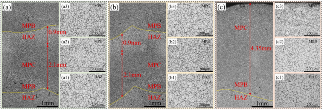 (1)具有独特的梯度分布的定制化微结构GWZ421K构件采用丝-弧DED技术制备。后续沉积层的在线热处理负责晶粒长大,导致HAZ区域晶粒粗大。由于较高的冷却速率和成分过冷度,在MPB区域获得了细化的晶粒。