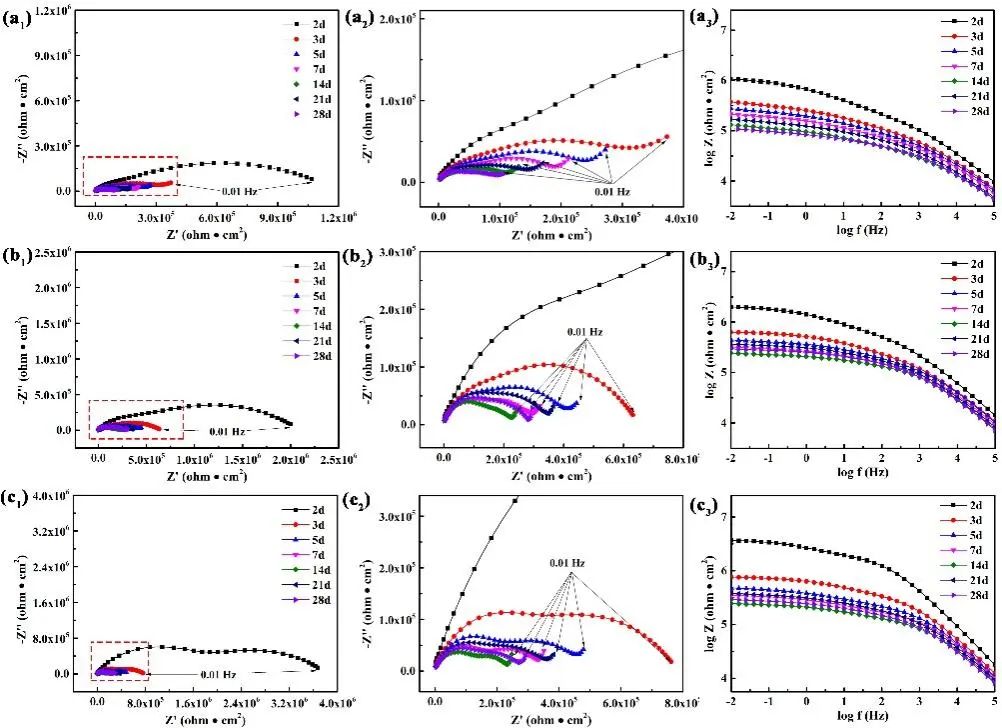 图3. (a1-a3)ZRE、(b1-b3)ZRE-Ti3C2Tx、(c1-c3)ZRE-Ti3C2Tx@PDA复合涂层EIS。