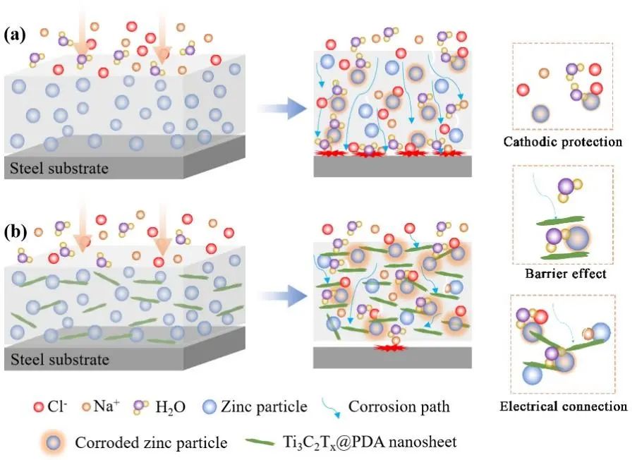 图5. ZRE及ZRE-Ti3C2Tx@PDA复合涂层防腐机理对比。