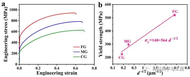 图2. (a) 不同晶粒尺寸的亚稳态高熵合金工程应力-应变曲线。(b) 屈服强度与平均晶粒尺寸的倒数平方根之间的关系。