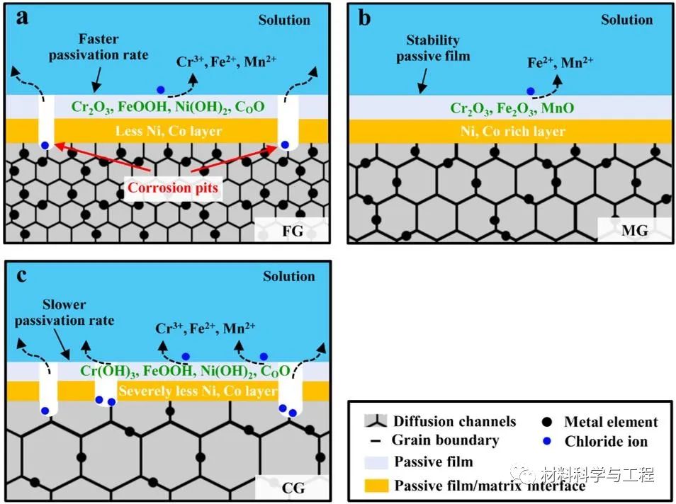 图8. 不同晶粒尺寸的亚稳态高熵合金的腐蚀机制示意图:(a) FG样品,(b) MG样品和 (c) CG样品。其中钝化膜的主要物种以在3.5 wt.% NaCl溶液中浸泡48 h后的化学成分来表示。