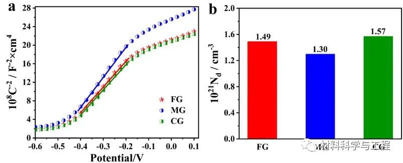 图4. (a) 不同晶粒尺寸的亚稳态高熵合金在 3.5 wt.% NaCl 溶液中浸泡 12 h 后的Mott-Schottky 曲线。(b) 钝化膜的施主密度。