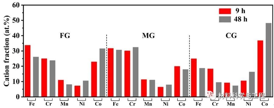 图6. (a) 不同晶粒尺寸的亚稳态高熵合金在 3.5 wt.% NaCl 溶液中浸泡 9 h和 48 h后钝化膜中阳离子分数的比较。