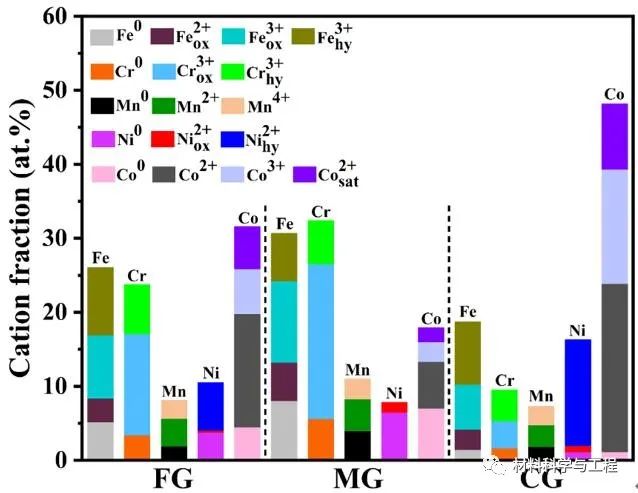 图5. 不同晶粒尺寸的亚稳态高熵合金在3.5 wt.% NaCl溶液中浸泡48 h后钝化膜的阳离子分数。