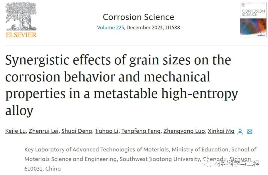 亚稳态高熵合金由于优异的机械性能而具有广阔的应用前景。一般来说,除了良好的强-塑结合外,耐腐蚀性也是作为先进结构材料需要评估的重要指标。但目前对这些亚稳态高熵合金的研究主要集中在机械性能上,对其腐蚀行为的研究不足。由于晶界具有高电化学活性和晶体缺陷,材料的腐蚀行为受到晶粒尺寸的影响,并且以往的研究还证实晶粒细化对材料腐蚀行为的影响存在一定的争议。此外,与晶粒尺寸对腐蚀行为影响相对应的机械性能变化可能并不是单调的,这意味着耐腐蚀性和机械性能之间可能存在某种权衡。因此,研究不同晶粒尺寸对亚稳态高熵合金腐蚀行为和机械性能的协同效应至关重要,因为对它们的基本了解将有助于进一步阐明晶粒尺寸对腐蚀行为影响的机制,并开发可承受恶劣环境的亚稳态高熵合金。