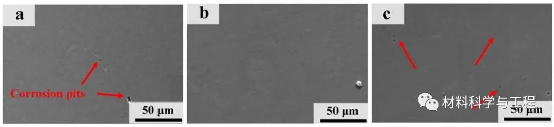 图7. (a) 不同晶粒尺寸的亚稳态高熵合金在3.5 wt.% NaCl溶液中浸泡48 h后的腐蚀形貌。(a) FG 样品,(b) MG 样品和 (c) CG 样品。
