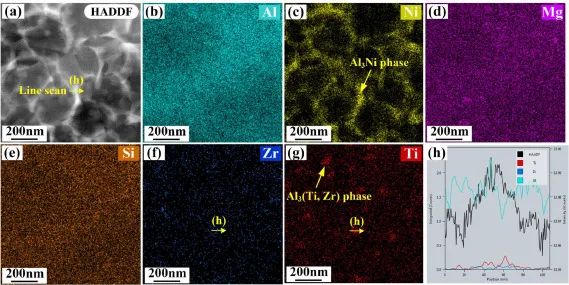 图14. HAADF-STEM下AT试样元素分布图:(a)合金暗场图像;(b)铝 (c)镍;(d)镁;(e)硅;(f)锆 ;(g)钛;(h) Al3(钛、锆)相元素线扫描结果。