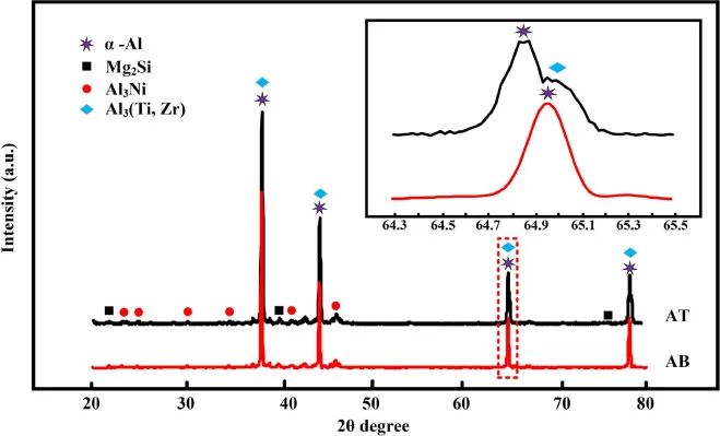 图12.AB试样和AT试样的X-ray diffraction(XRD)谱图。右上图为红色虚线框部分的特写。