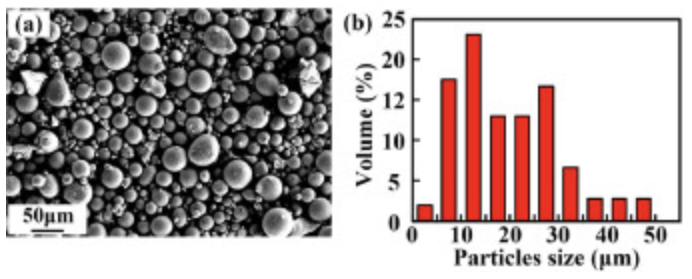 图1.AlNi6TiZr合金粉末:(a) SEM形貌;(b)粒径分布。