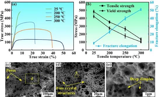 图10.AlNi6TiZr合金高温拉伸性能:(a)应力-应变曲线;(b)强度与伸长率比较;(c-e) AlNi6TiZr合金高温拉伸断口形貌。