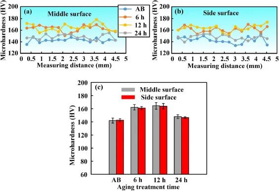 图11. 325℃时效不同时间后AlNi6TiZr合金的显微硬度:(a)中间表面;(b)侧面;(c)平均显微硬度比较。