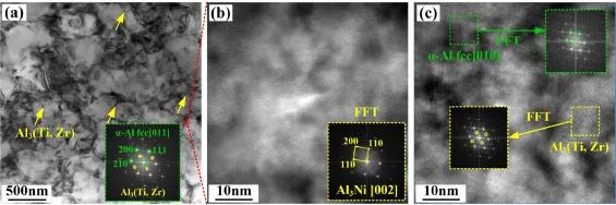 图16. AT合金的相分布及鉴别:(a) Al3(Ti, Zr)相的分布特征;(b) Al3Ni相;(c) α-Al和Al3(Ti, Zr)相。
