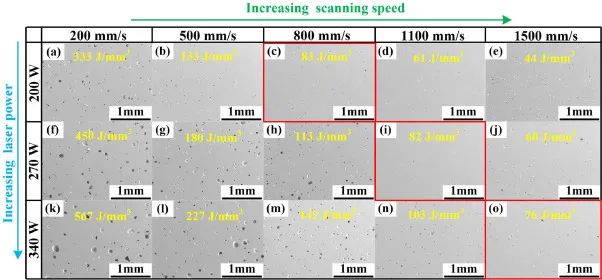 图2.不同SLM工艺参数下AlNi6TiZr合金的SEM孔隙率分布。