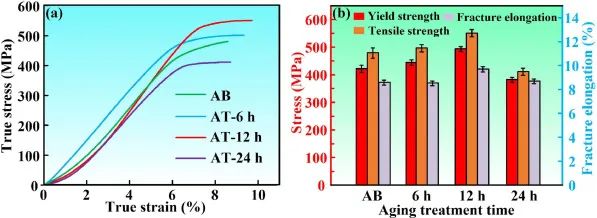 图8.325℃不同热处理时间下AlNi6TiZr合金的拉伸性能:(a)应力-应变曲线;(b) AB和AT试样的强度和伸长率比较。