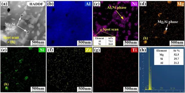 图13. HAADF-STEM下AB试样元素分布图:(a)合金暗场图像;(b)基地;倪(c);(d)毫克;(e)如果;(f) Zr型;(g)钛;(h) Mg2Si相元素点扫描结果。