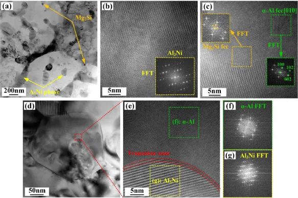 图15. AB样品的相分布及鉴定:(a) Mg2Si和Al3Ni相的TEM图;(b) Al3Ni相;(c) Mg2Si相和α-Al;(d)单粒TEM图像;(e) α-Al和Al3Ni相;(f) α-Al的衍射图;(g) Al3Ni相的衍射图。