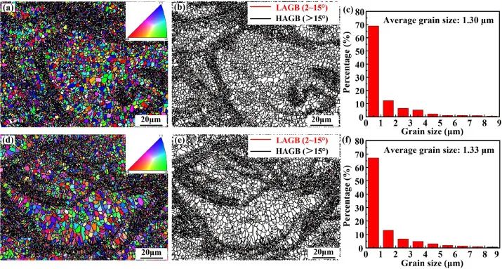 图5. AB试样AlNi6TiZr合金的晶粒形貌、晶界分布和晶粒尺寸分布:(a-c);(d-f)为时效处理的标本。