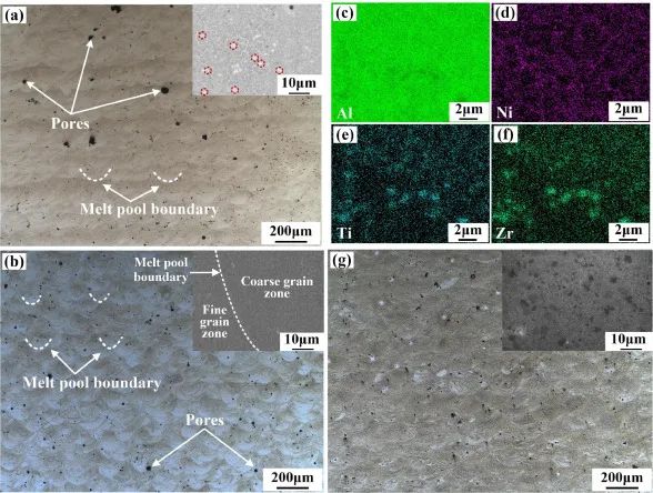 图4.AlNi6TiZr合金的显微组织:(a)试样侧面;(b)试件的中表面;(c) Al, (d) Ni, (e) Ti, (f) Zr元素分布特征;(g) AT试样(325℃-12 h)的显微组织。