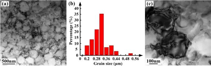 图7.AT合金的TEM图像:(a)晶粒图;(b)粒度统计图;(c)单个颗粒的图像。