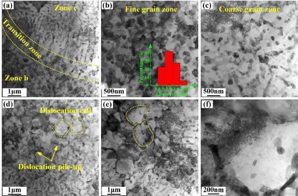 图6.AB合金的透射电子显微镜(TEM)图像:(a)单激光熔池边界;(b)激光熔池边界处的细晶粒区;(c)激光熔池中心区的粗粒区;(d, e)位错堆积和位错细胞;(f)单个错位细胞。