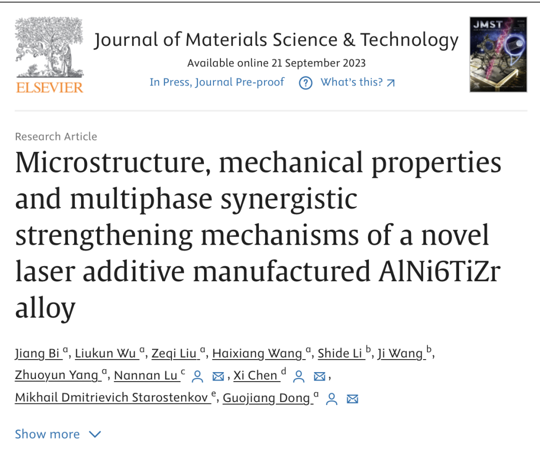 燕山大学的相关研究以“Microstructure, mechanical properties and multiphase synergistic strengthening mechanisms of a novel laser additive manufactured AlNi6TiZr alloy”为题发表在Journal of Material Science & Technology上。