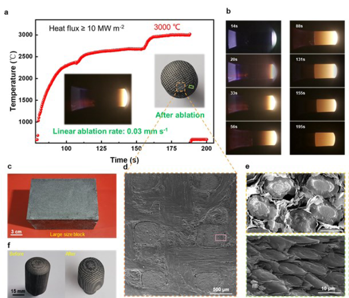 在航天器中用作热结构部件时,C/C 复合材料将遭遇严重的高温烧蚀和热通量侵蚀环境,这可以通过电弧风洞装置进行模拟。图 4a 显示了 C/C 复合材料在弧形风洞停滞点烧蚀 200 秒后的温度曲线和宏观形态。最终的线烧蚀速率为 0.03 mm s-1,烧蚀性能优于文献报道的同类材料。由于 S-C/C 具有较高的热导率,材料的表面响应温度随时间逐渐升高。图 4d 显示,样品表面在最初的 30 秒内被一层空气覆盖,这可以有效保护表面材料免受氧化侵蚀。出现这种现象的原因是碳材料中的热解气体可以与边界层中的氧气发生反应,从而减缓材料表面的烧蚀。30 秒热通量之后,样品顶部逐渐升温并发光,直到大约 90 秒,表面反应温度逐渐超过 1000 °C。样品在热通量作用下逐渐后退,但整体形状仍为圆柱形。120 秒后,温度逐渐升高到 2500 ℃ 以上,样品发光。大约 160 秒后,温度急剧升高到 3000 °C,并保持这一最高温度直至试验结束。值得一提的是,S-C/C 在整个烧蚀过程中都保持了圆柱形,而且烧蚀过程非常均匀。图 4f 比较了样品在烧蚀前后的宏观照片。从烧蚀后的照片中可以看出,样品表面保持平整,没有出现坍塌或大面积剥落。对烧蚀后样品微观结构的分析表明,表面非常平整(图 4d),在高热通量环境中进行测试后,证实 S-C/C 复合材料具有出色的抗烧蚀和侵蚀能力,不会出现剥落和明显的形状变化。