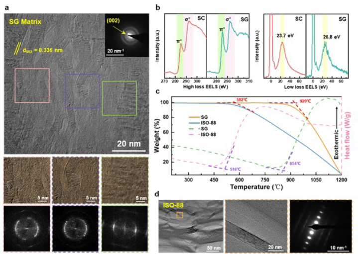 在 C/C 复合材料中,纤维和基体之间存在一个界面区。在制备 S-C/C 复合材料时,需要多次重复混合水溶液浸渍-凝胶化-预碳化-碳化-石墨化过程,使 S-C/C 复合材料 90% 以上的孔隙得到填充。致密化后,S-C/C 复合材料的表面非常平整(图 3a),内部纤维束充满了 SG。通过 FIB 对 SG 基体和碳纤维之间的界面区域进行了微观结构分析(图 3b)。由于从明场图像中可以看出,碳纤维和 SG 基体的微观结构区别非常明显。图 3d-1 区域显示的是碳纤维,它是典型的无定形碳,图 3d-2 区域显示的是靠近纤维的无定形界面区域。图 3d-3 区域显示了纳米晶石墨基体的微观结构以及远离纤维的非晶界面区域,在该区域非晶衍射图样逐渐消失。图 3d-4 所示区域呈现出良好的结晶形态。从上述整个界面的微观结构演变可以看出,在 SG 基体和碳纤维之间存在一个无定形过渡层。