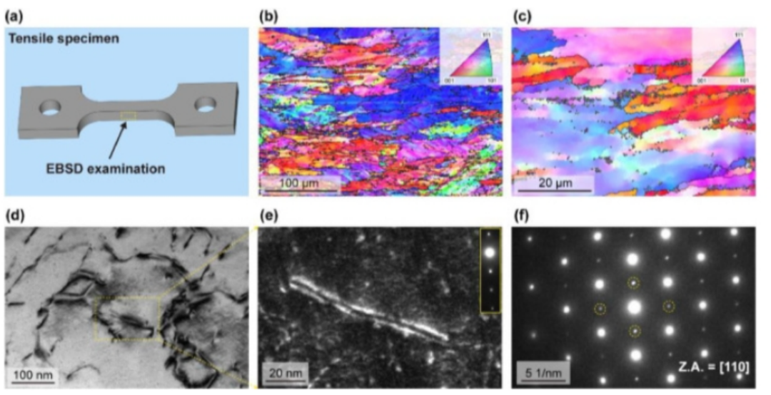 图2 LS-CCIMA的基本微观结构。(a) 高温拉伸试样示意图和EBSD观测结果。(b) IPF图,显示典型的异质层状结构。(c) 放大的IPF图,显示平均宽度为 5μm的层状颗粒。(d) 高炉透射电镜显微照片,表明存在成对脱位。(e) WBDF图像显示L12有序晶粒内的超晶格位错对,该晶粒是从g / 3g方向收集的,g = 002在[110]区域轴上。(f)识别L12型结构,由沿[110]区轴的SAED模式支撑。