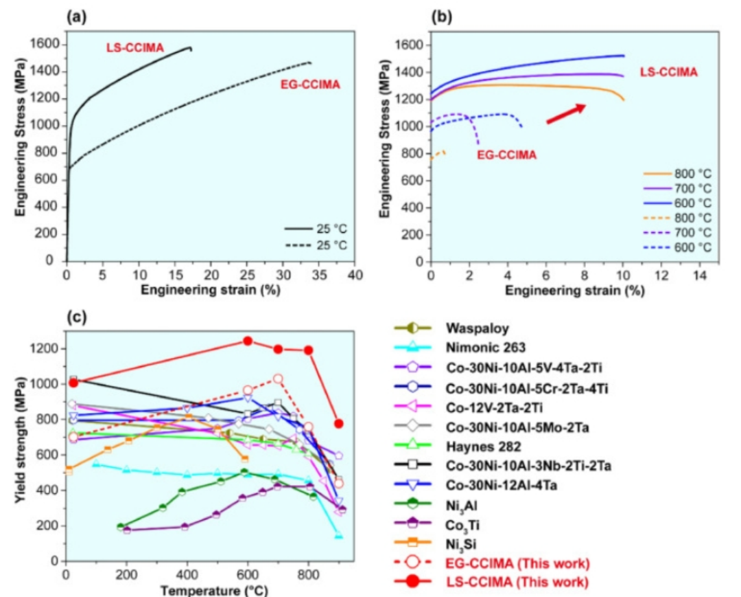 图4 我们的CCIMA的机械性能。(a)和(b)EG和LS-CCIMA在宽温度范围内(25°C 800°C)的典型工程应力-应变曲线。(c) LS-CCIMA的优越中间温度YS。参考物质包括简单有序合金和常规高温合金。