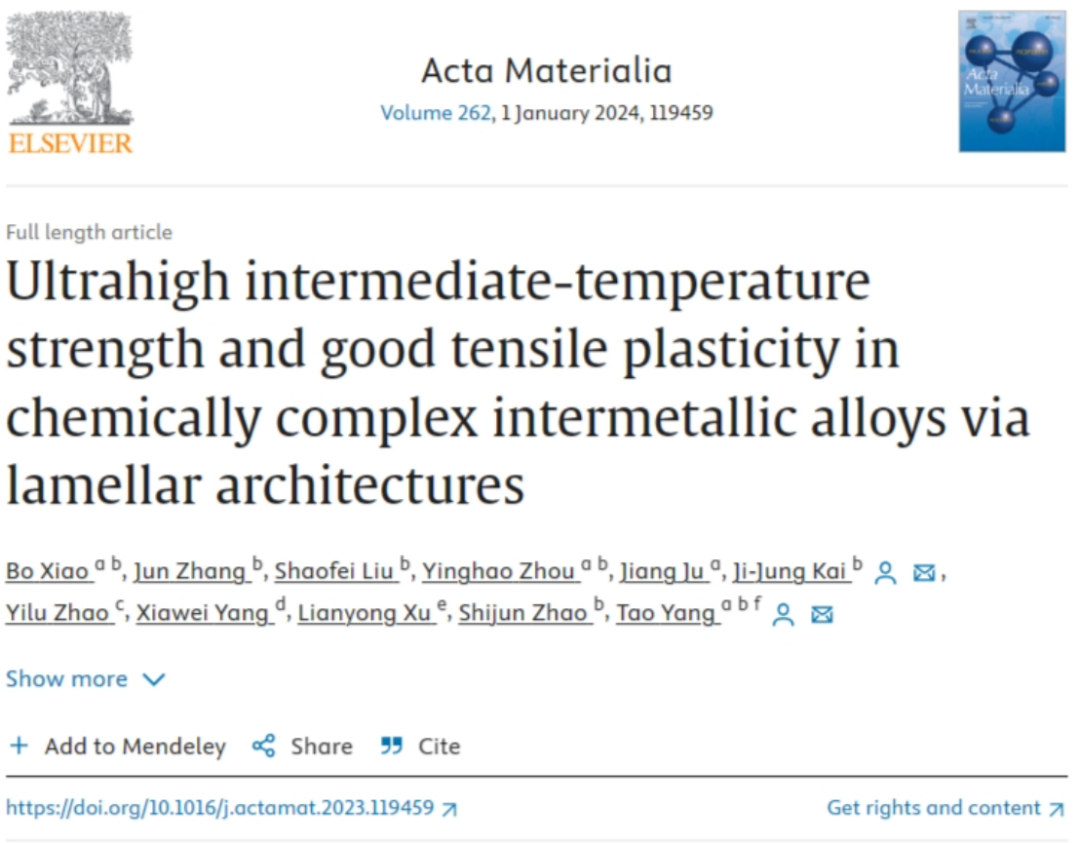相关研究成果以题“Ultrahigh intermediate-temperature strength and good tensile plasticity in chemically complex intermetallic alloys via lamellar architectures”发表在国际期刊Acta Materials上。