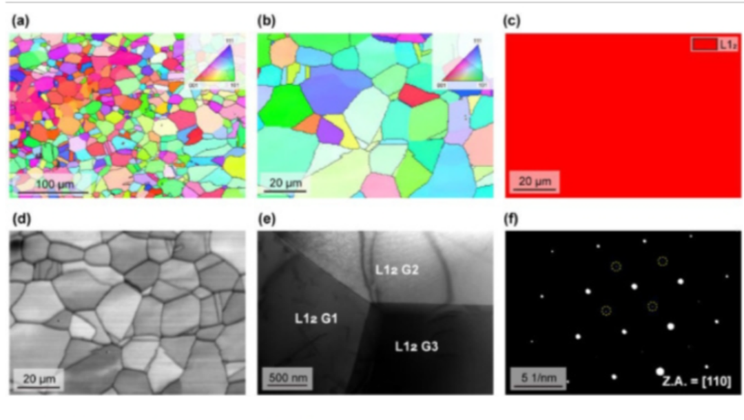 图1 EG-CCIMA的微观结构。(a)和(b)反极图(IPF)图和彩色图例的插图。(c) 相位图。(d) 智商图。(e) 显示典型等轴晶粒的高炉透射电镜显微照片。(f)SAED图沿[110]区轴取,确认有序的L12型晶体结构(Z.A.表示为区轴)。