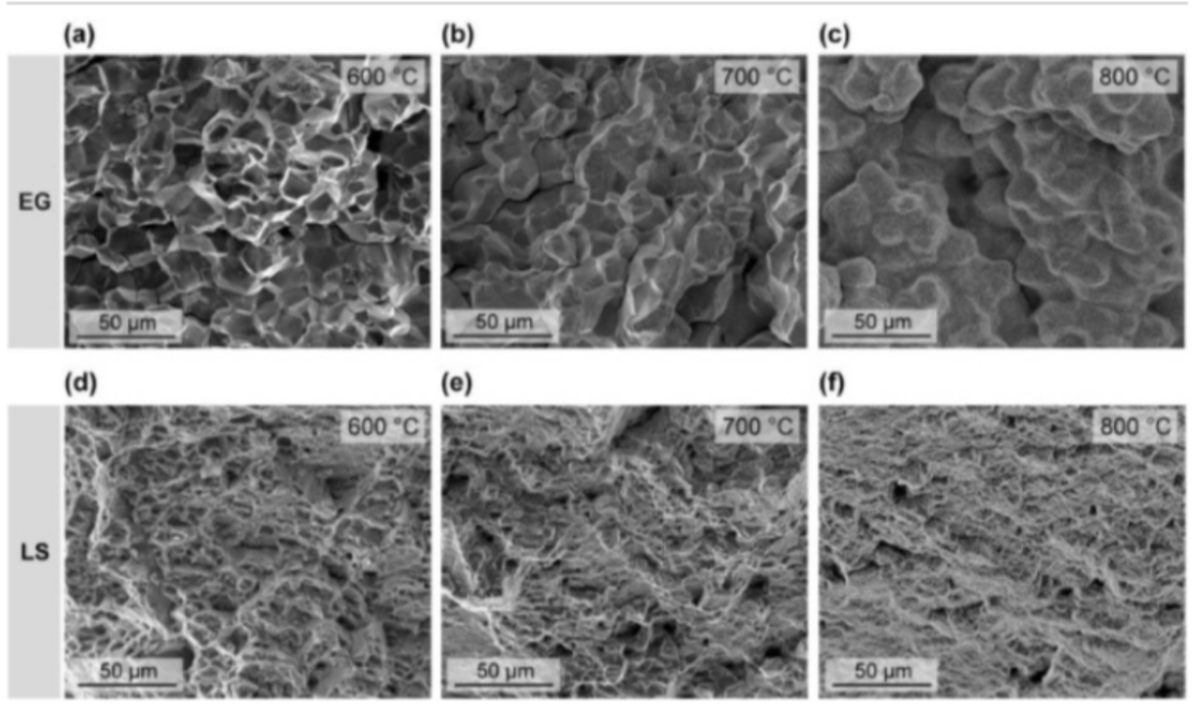 图6 EG-和LS-CCIMA在中间温度状态下的断裂形态。(a)-(c)显示了EG-CCIMA在600、700和800 °C温度下的断裂面,表现出典型的晶间断裂模式。(d)-(f)在600、700和800°C下呈现LS-CCIMA的断裂面。清楚地观察到典型的延展性制造模式。