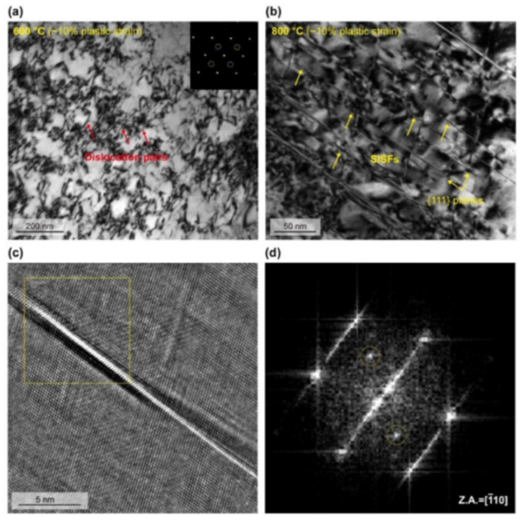 图9 LS-CCIMA在中间温度(600和800°C)下的变形子结构。(a) LS-CCIMA在600 °C下被约10%塑性应变变形的位错构型,表明产生了许多位错对。(b)LS-CCIMA的微观结构在800 °C下被约10%的塑性应变变形,表现出变形诱导的高密度SISF和SISF网络。(c) 高分辨率透射电镜图像给出了由SISF剪切的有序L12型相位的典型示例。(d) 含有SISF的L12型相的相应FFT图像。