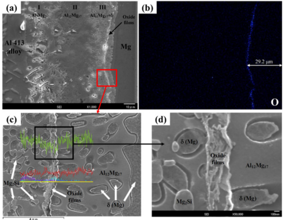 图24. Al 413/Mg双金属的界面显微组织:(a) 低倍率下的显微组织;(b) O元素的映射扫描;(c) 和 (d):高倍率下的显微组织。