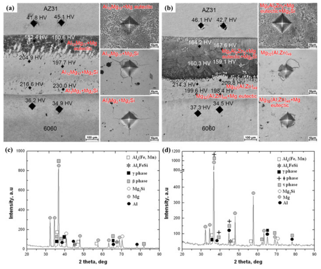 图40. 镀锌Al 6060/Z31双金属的微观结构和XRD结果:(a) 未镀锌的界面微观结构和压痕的SEM图像;(b) 镀锌的界面微观结构和压痕的SEM图像;(c) 未镀锌区域的XRD结果;(d) 镀锌区域的XRD结果。