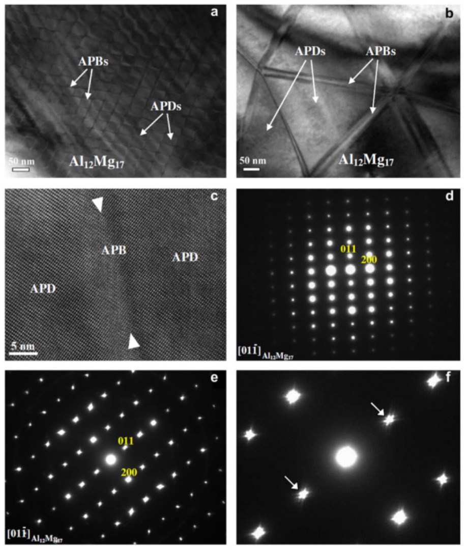 图4. Al12Mg17反应层的透射电子显微镜结果:(a, b) 两个不同区域的明场图像;(c) APD和APB的高分辨透射电子显微镜图像;(d, e) 分别为图4(a)中单个领域和多重领域的选择区域电子衍射图像;(f) 图4(e)的放大图。