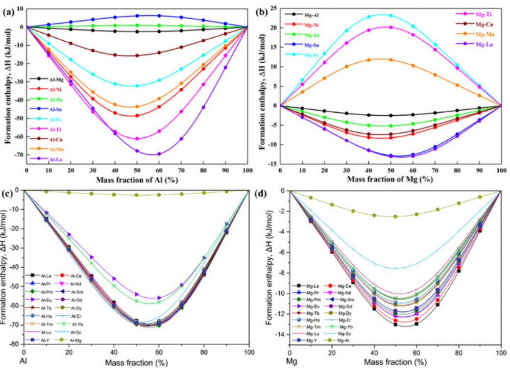 图39. 不同元素与Al或Mg的形成焓:(a) Al和其他元素;(b) Mg和其他元素;(c) Al和稀土元素;(d) Mg和稀土元素。