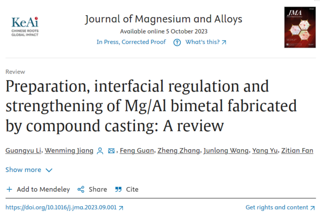 在上述问题的影响下,目前通过复合铸造制备的镁/铝双金属的性能不能满足实际使用的要求,因此需要进一步改进。镁/铝双金属的性能主要与Al-Mg界面有关。因此,如何调控镁/铝双金属的界面成为当前研究的重点和热点。华中科技大学蒋文明教授团队首先介绍了复合铸造制备镁/铝双金属的方法和现有问题。接着,总结了对镁/铝双金属界面进行调控和强化的研究,并提出了几种潜在的双金属强化方法。相关研究以题“Preparation, interfacial regulation and strengthening of Mg/Al bimetal fabricated by compound casting: A review”发表在期刊Journal of Magnesium and Alloys上。