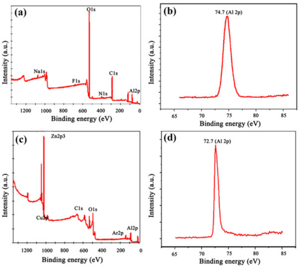 图34. A390的XPS结果:(a, b) 未处理;(c, d) 经过“锌化+镀锌”处理。