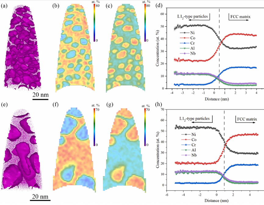 图2 . ( a-d )再结晶态合金和( e-h )时效态合金APT针的元素分布分析。采用35个 at . % Co等成分面定义的L12 / FCC界面进行( a , e) 3D - APT重建。Co和Cr浓度图( b , f)二维投影图。Ni、Al、Nb浓度图( c , g)二维投影图。( d , h) Proximity柱状图描述了L12析出相与FCC基体界面处的成分分布。利用杠杆定律计算出再结晶态和时效态合金中L12纳米颗粒的体积分数分别为26.3 %和33.4 %。