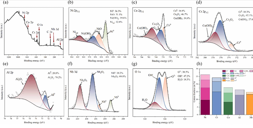 图5 .对室温下在3.5 wt . % NaCl溶液中0.2 VSCE下恒电位生长7200 s的老化试样表面钝化膜进行XPS分析。( a )钝化膜中( b ) Ni 2p3 / 2,( c ) Co 2p3 / 2,( d ) Cr 2p3 / 2,( e ) Al 2p,( f ) Nb 3d,( g ) O 1 s ( h )阳离子组分的XPS测量谱和高分辨谱。
