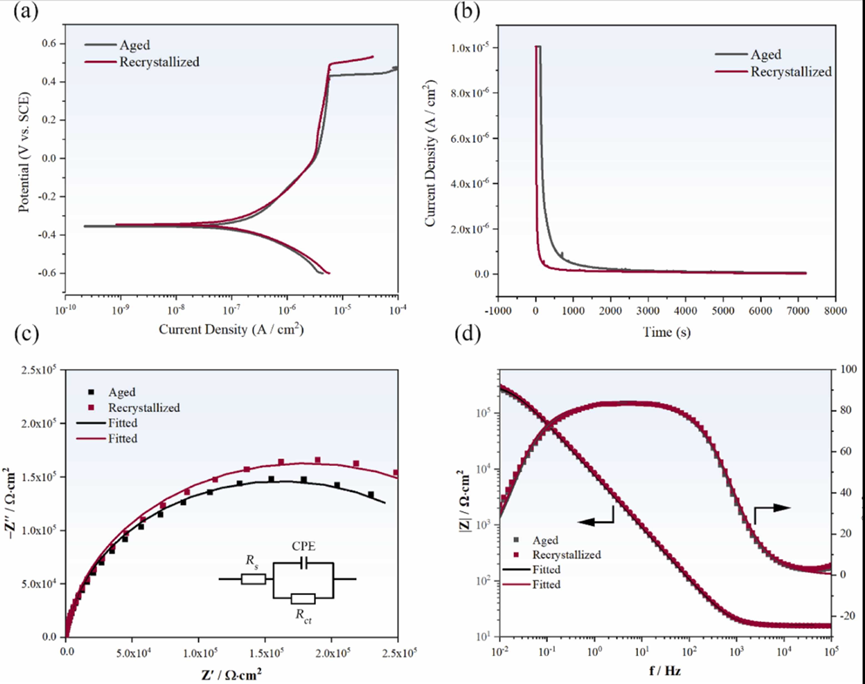 图3 . Al5Nb5高熵合金的电化学表征。( a )室温下再结晶试样和时效试样在3.5 wt . % NaCl溶液中的动电位极化曲线,( b )动电位极化曲线( 0.2 VSCE , 7200 s)。( c ) OCP条件下,再结晶和时效样品在3.5 wt . % NaCl溶液中的Nyquist图和( d ) Bode图。( c )中的inset是用于拟合EIS数据的电气等效电路( EEC ),其中Rs是溶液电阻,Rct是电荷转移电阻,CPE是恒定相元件。