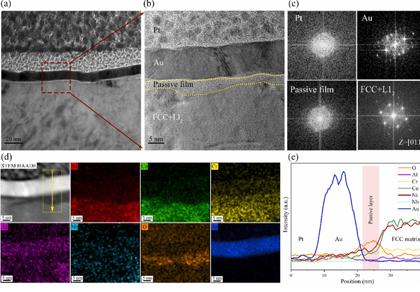 图6 .老化试样表面恒电位生长钝化膜的成分和结构表征。( a )明场TEM图像显示钝化膜连续、均匀地分布在合金表面。( b )高分辨TEM图像清晰地显示了4个不同的特征层,从上到下分别为:Pt层、Au层、钝化膜和L12增强的高熵合金。黄色虚线标出钝化膜的位置。( c )快速傅里叶变换( FFT )图对应于( b )中的四个层,其中钝化膜具有非晶态结构。( d ) STEM - HAADF图像和包括O和Au在内的各种元素的映射,证明钝化膜主要富集O、Cr和Ni元素。( e )从( d )中概述的黄色矩形中进行综合线扫描,进一步证明了富氧化物钝化膜的存在。