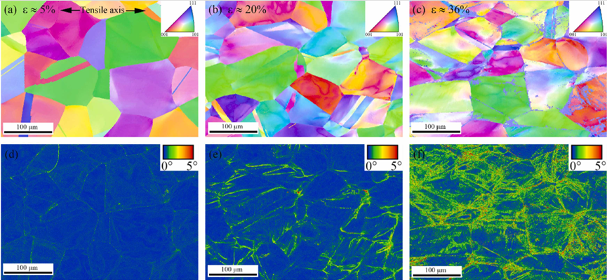 图9。断续变形后时效试样的EBSD表征为( a , d) ε ≈ 5 %,( b , e) 20 %,( c , f) 36 %。( a-c )逆极图( IPF )图像和( d-f )核平均取向差( KAM )分布图。