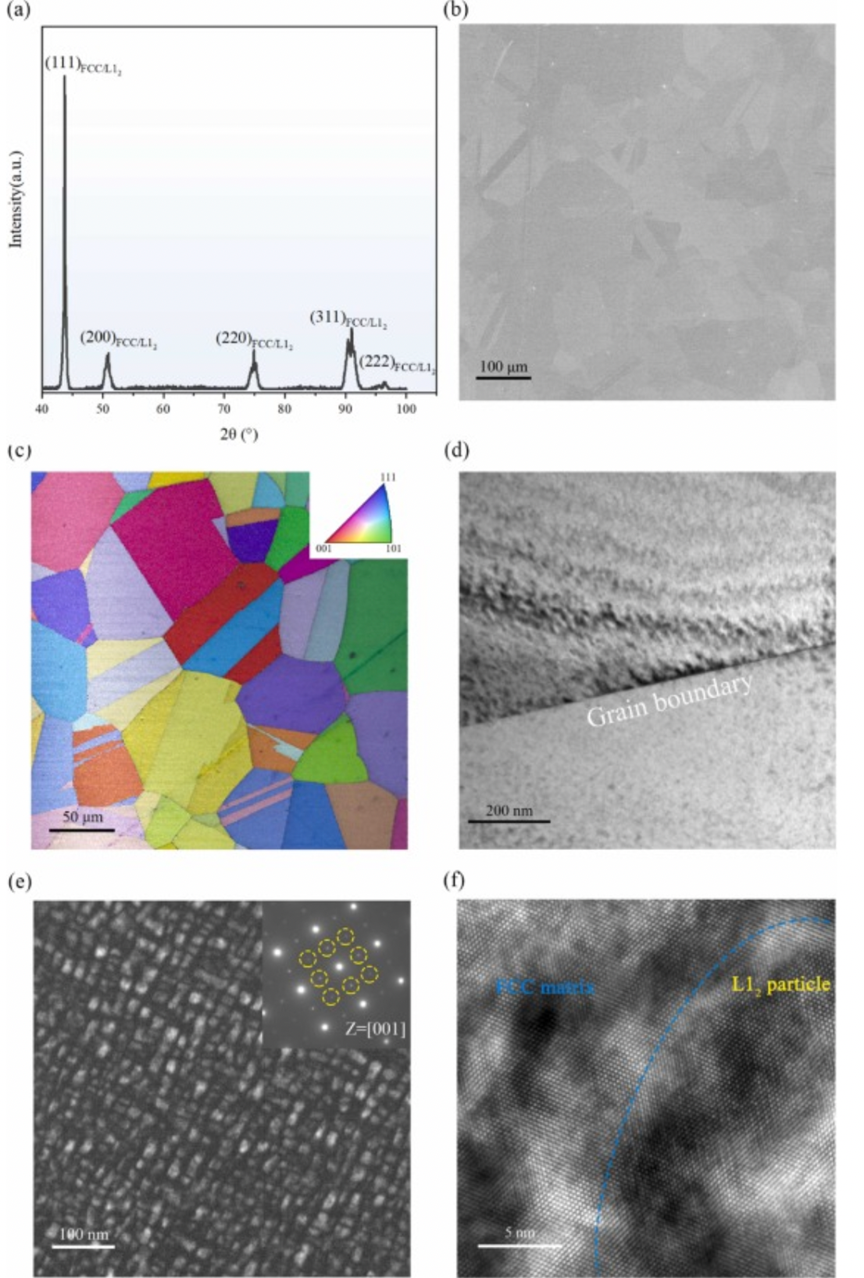 图1 .时效态Al5Nb5高熵合金的微观组织分析( a ) XRD图谱显示" FCC + L12"双相结构。具有代表性的( b ) SEM和( c ) EBSD图像显示了完全再结晶的多晶组织,包括约50 μ m的等轴晶粒。( d )明场TEM照片显示晶界上没有可测量的不连续析出相。( e )暗场TEM图像给出了L12析出相的形貌和分布,其内部显示出沿[ 001 ]方向的SADP,其中L12析出相的超点阵点呈黄色圆环状。( f )高分辨率TEM图像显示L12纳米颗粒均匀地镶嵌在FCC基体中。
